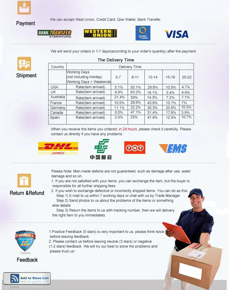 Товары будут отправлены обычной авиапочтой Почта Китая; Thre не отслеживает информацию, но это безопасно как зарегистрированный пост. Обычно это занимает около 15-60 дней в США, Европе и других местах по всему миру.