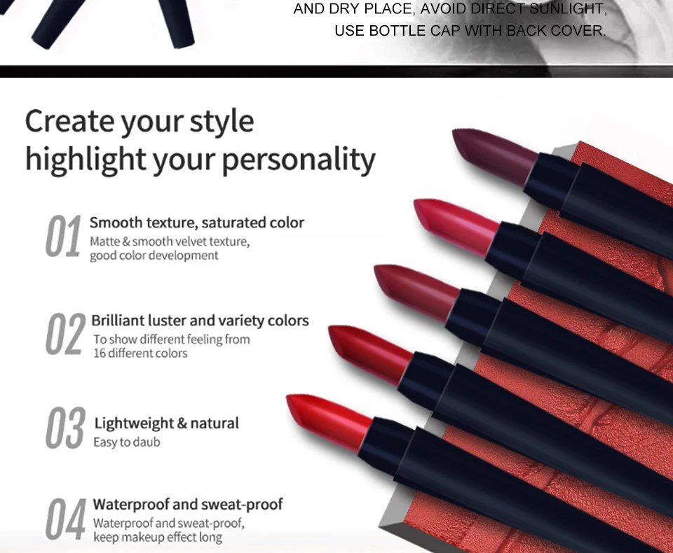 Functions: Long lasting lipstick, Waterproof, Moisturizing, Nutritious, Easy to Wear