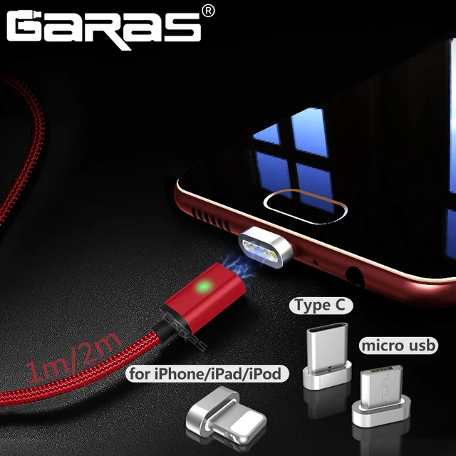 GARAS Магнитный кабель для lightning/Micro USB/Тип C переходник для зарядного устройства Разъем Iphone Магнит быстрой зарядки кабели мобильных телефонов 2 м