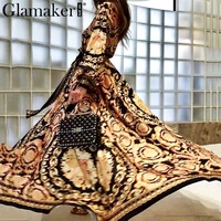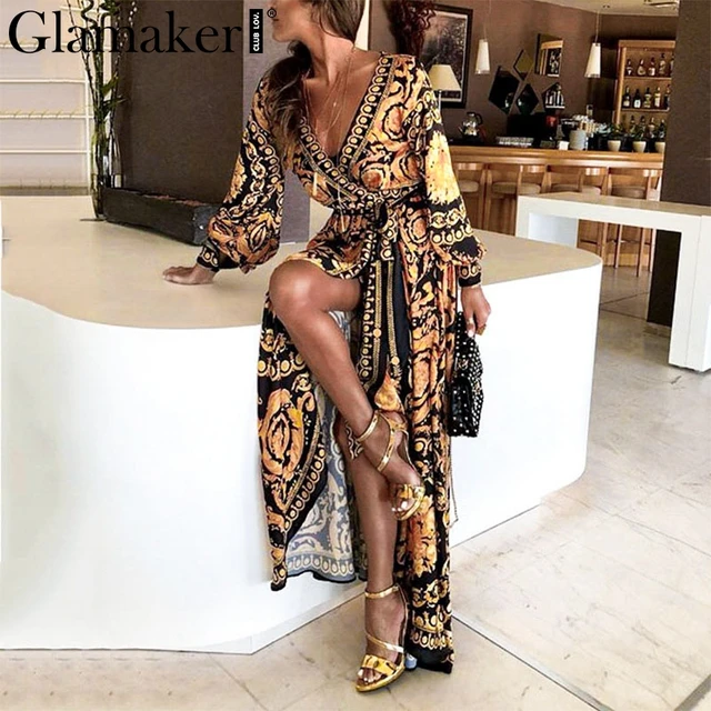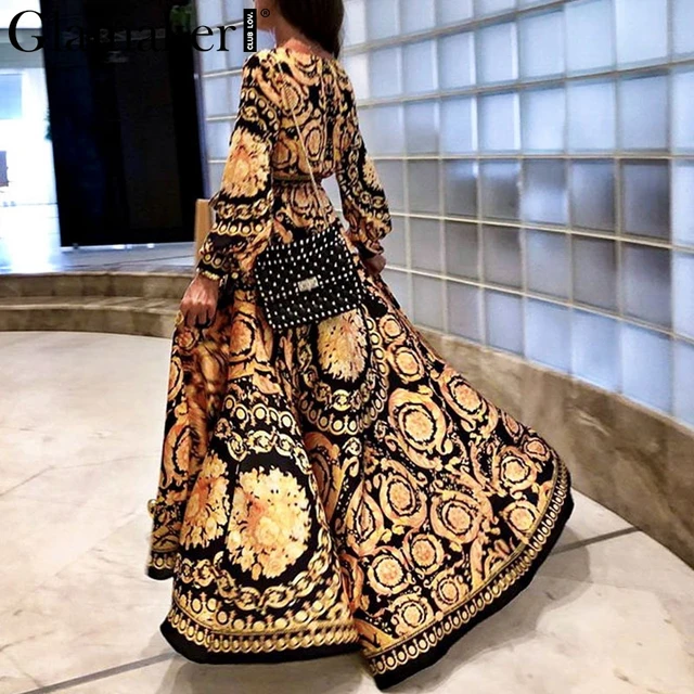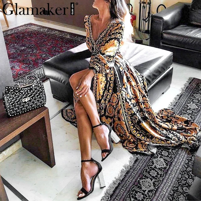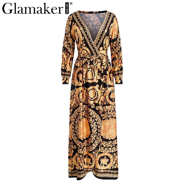 Glamaker винтажное раздельное Золотое рождественское платье женское зимнее элегантное платье с принтом Платье макси с длинным рукавом Осень свободное Вечерние вечернее Бохо сексуальное платье купить