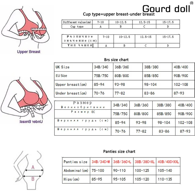| Например: ваш верхний размер груди составляет 97,5 см, Под грудью размер 85 см, Разница в размере 12,5 см, Соответствующий cup чашка B, Тогда ваш размер бюстгальтера 85 B. |