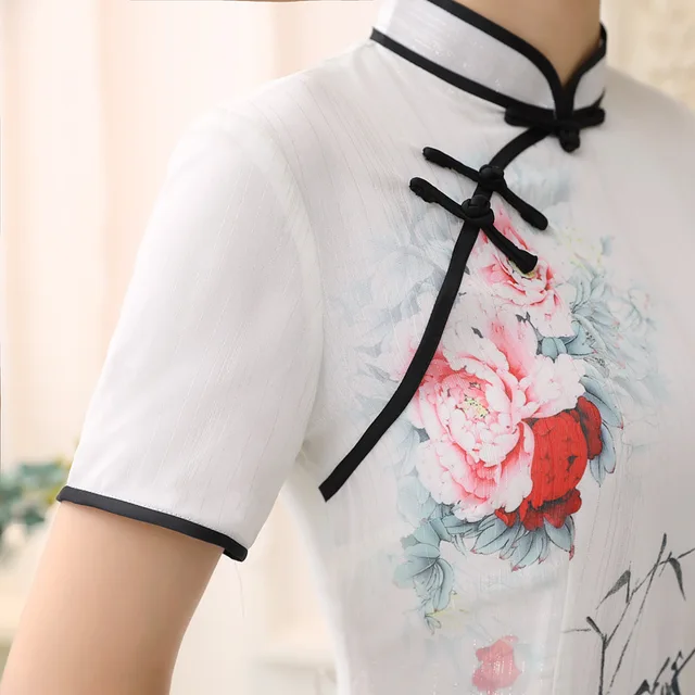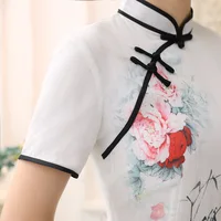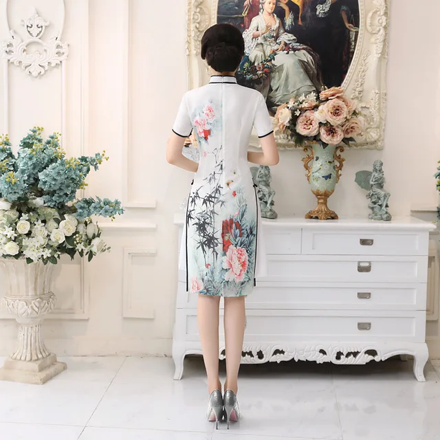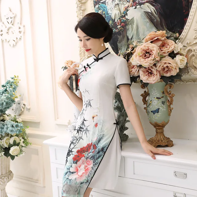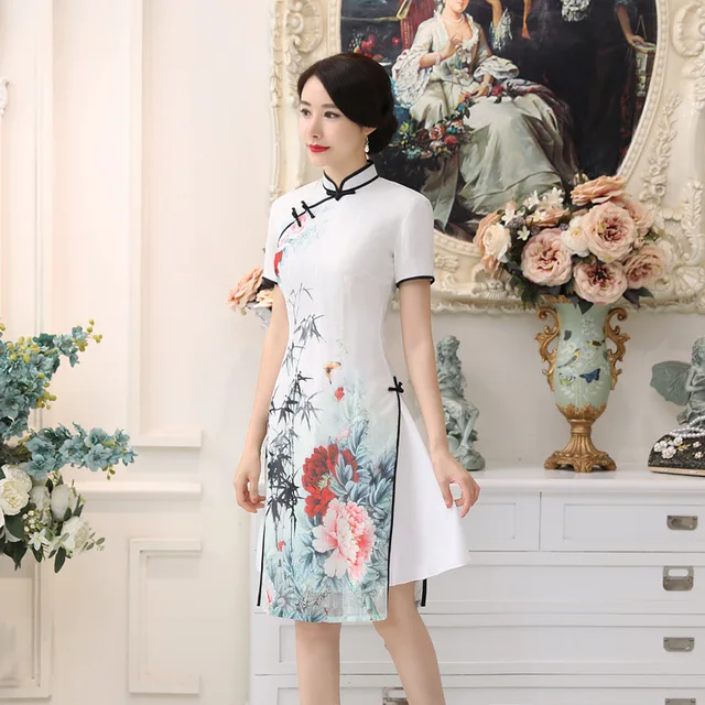 2018 Лидер продаж пикантные Белый сатин Вьетнам аозай платье в традиционном китайском стиле дамская Короткий рукав печати элегантный короткое платье; S-3XL AD3 купить